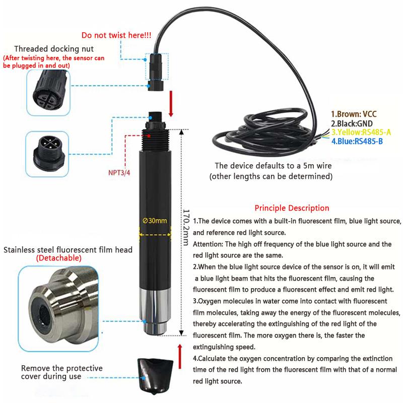 LoRa water quality dissolved oxygen sensor is a device used to measure the concentration of dissolved oxygen in a solution. It adopts the principle of fluorescence measurement and does not require oxygen consumption or electrolyte. The sensor is equipped with a built-in temperature transmitter, which can achieve automatic temperature compensation. It is also equipped with imported quality fluorescent film, which has stable and reliable performance.