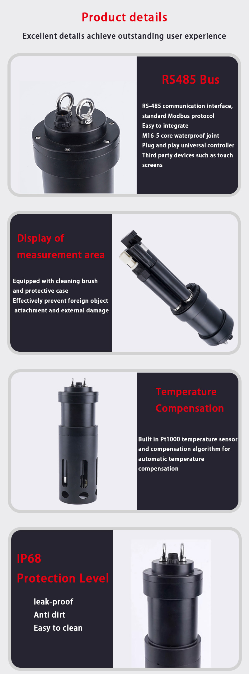 Featuring an industrial-grade IP68 waterproof design and corrosion-resistant materials, it operates continuously in challenging water environments (e.g., wastewater tanks, coastal aquaculture) with minimal maintenance requirements.