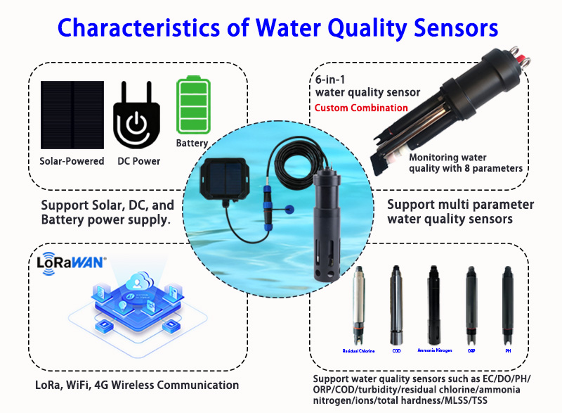 LoRaWAN solar water quality multi parameter sensor is an "all-around player" that can connect 6 water quality sensor probes at once to monitor 8 water quality parameters, collect real-time water quality sensor data, achieve wireless transmission, and has low power consumption. It does not require frequent battery replacement and can achieve long-term stable battery life. It is an energy-saving expert in IoT devices.